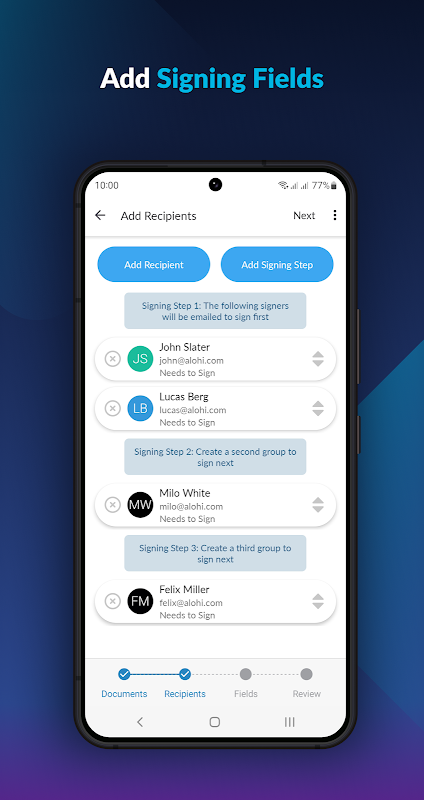 Send documents for signature: Other than the option to fill and sign documents yourself, you can also send documents for signature. You can send a request for signature even if the signees do not have a Sign.Plus account. With this eSignature and form filling app, you can add various fields to the documents, including signature, initials, date, text, and checkbox.