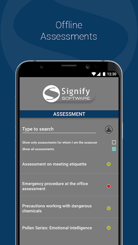 The Signify Online Assessment App enables assessors to conduct workplace observations (practical assessments) anywhere by using their Android mobile device. The Assessments can be downloaded to the mobile device and completed offline.