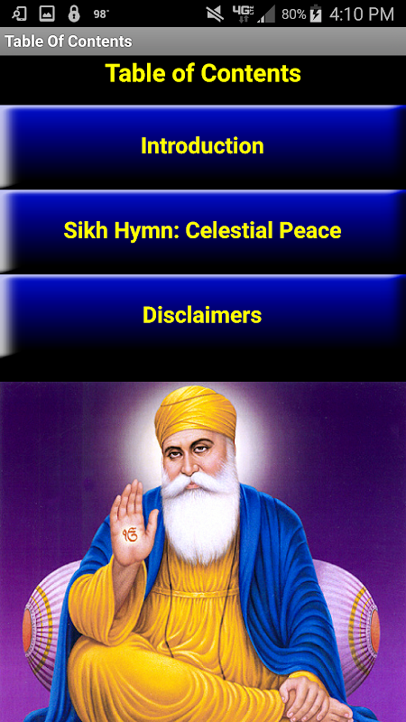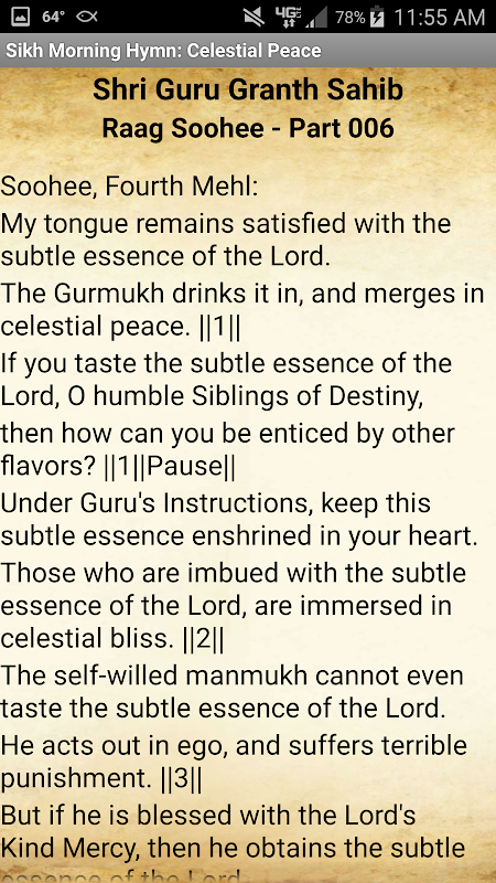 This app contains a poetic hymn from the Shri Guru Granth Sahib, Sikhism's holy Scripture. Such hymns are written in raag or raga, a classical Indian musical system. The Sikh code of conduct advises that kirtan (songs of praise) be performed in raag (or raga) according to Sikh tradition. "Raag Soohee" like this one are favored for the morning hours, and are said to inspire happiness and fulfillment. This particular hymn celebrates the celestial peace and bliss granted by the Grace and Love of God.