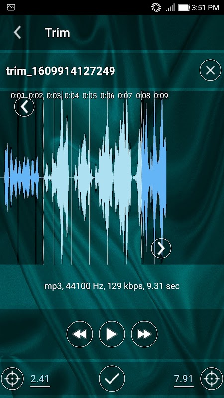 - Trim. Load audio file and tim (cut) parts. Select the desired section of the file and save it.