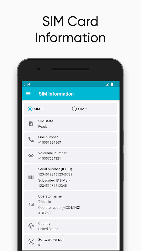 It lets you quickly access information about your device SIM cards, network status, device information, and the data stored on the primary SIM card.