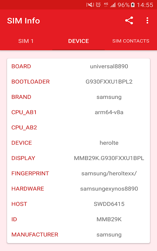 A Device tab is offered and displays some static information on your smartphone or tablet like : Board value, Manufacturer, Brand, Display code, Hardware of the device or the Bootloader used. Finally, the SIM Contacts tab lets you to discover all the Contacts saved in your SIM Card. With a long touch on a Contact you can copy the number associated in your clipboard.