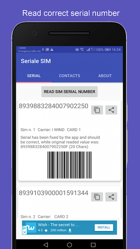 - Fast and smart app that reads sim card serial number, gives you the barcode (very useful for the store employees) and gives you the possibility to copy or share your sim serial number.