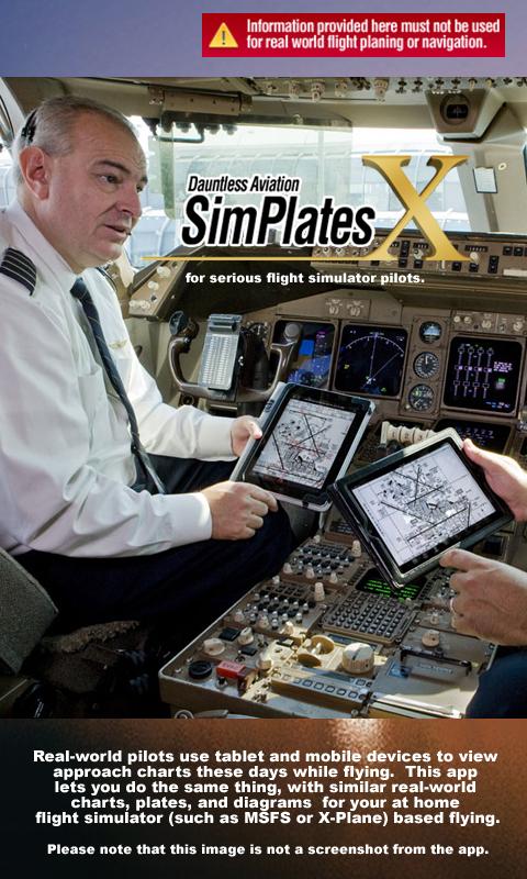 SimPlates brings you the world’s largest collection of real-world IFR approach (and other) charts for the serious flight simulation enthusiast to your fingertips! SimPlates is not a flight simulator program in and of itself, but can be used as a companion on your android tablet or phone-type device concurrently with your enjoyment of your preferred computerized desktop flight simulation program to help expand the realism and excitement of the experience. SimPlates has been called "a must have for the serious flight simulator enthusiast" and "a great addition to your flight sim bag" by major flight simulation websites in independent reviews.