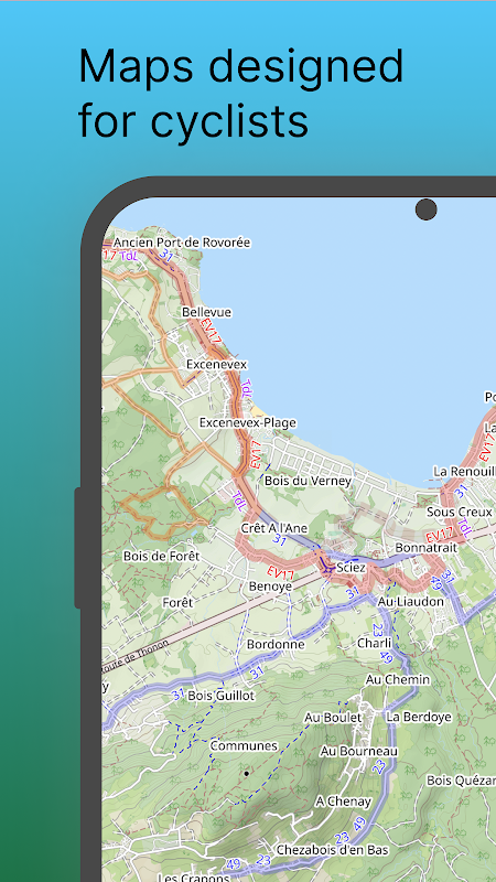 Follow your route as you ride, the map will rotate to follow your route as you cycle. If you choose to record your bike you will be able to recall it or export it to other apps.