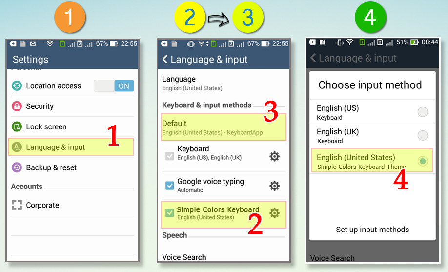 - Click to select Default English (United States) - Simple Colors Keyboard Theme.