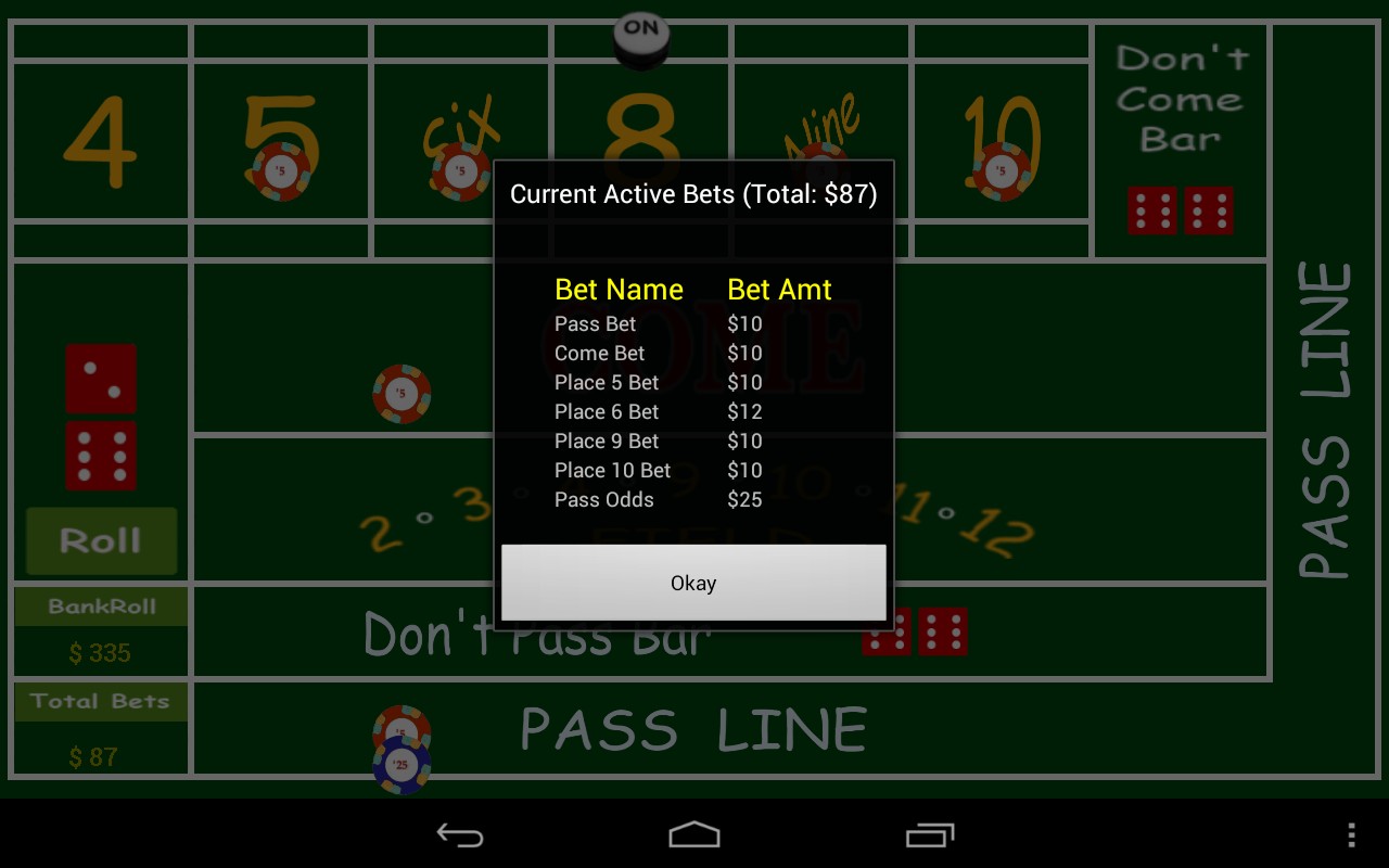 This version of Craps contains the basic bets for learning the game. It's easy to use and keeps track of your profit or loss during the game and also keeps track of the dice totals rolled so you can see the frequency of each total.