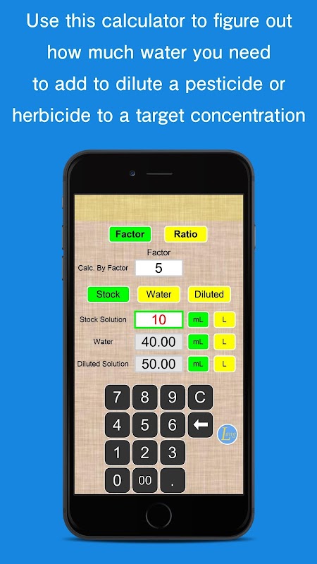 "Simple Dilution Calculator" allows you to do simple calculations for liquid dilution. You can use this tool to figure out how much water you need to dilute your pesticide, herbicide or juice.
