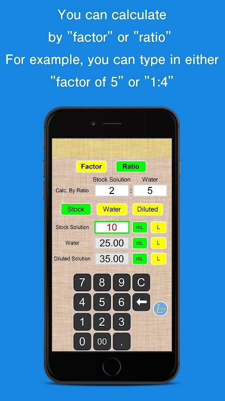 Also, Simple Dilution Calculator allows you to calculate by either "factor" or "ratio".