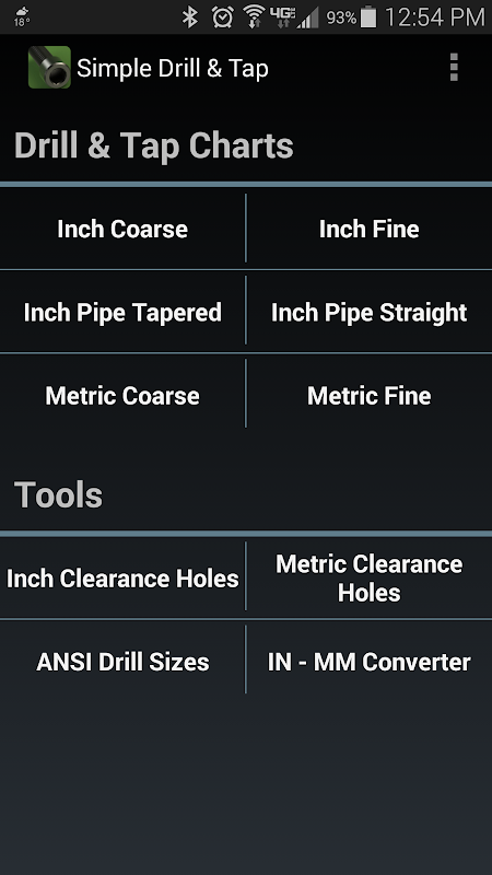 This app gives drill and tap tables for all common thread sizes including: United National Coarse, United National Fine, National Pipe Tapered, National Pipe Straight, Metric Coarse, and Metric Fine. The drill and tap tables show drill letters and decimal values.