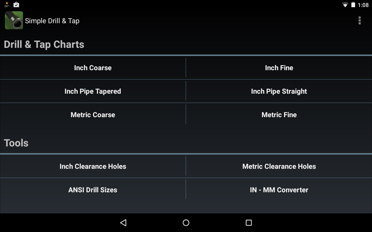 This app is a simple drill & tap reference guide. The interface is designed to be quick so that you can get back to your project without messing with your phone or tablet too much.