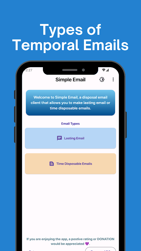 "Simple Email 📧✨: Effortlessly create and manage disposable emails for secure, spam-free online interactions! 🔒📨 Perfect for signing up on websites, accessing exclusive content, or safeguarding your personal inbox from unwanted messages. 🚀🛡️ With Simple Email, enjoy a clean and organized email experience without the hassle. 📬🧹 Stay in control of your privacy and keep your main inbox clutter-free. 🌟📧 Get started now and simplify your online life! 🌐🗝️".