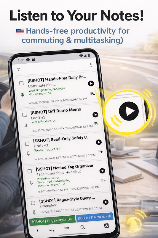 Yomi Memo is a note app with text-to-speech, review reminders, and playlists. Write your own notes, share text from other apps, and keep learning while commuting, walking, cooking, or doing chores.