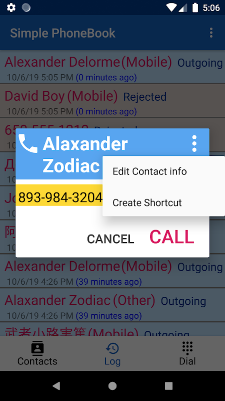 All contact names are sorted by alphabetical and Hiragana order (Originally this app is made for Japanese).