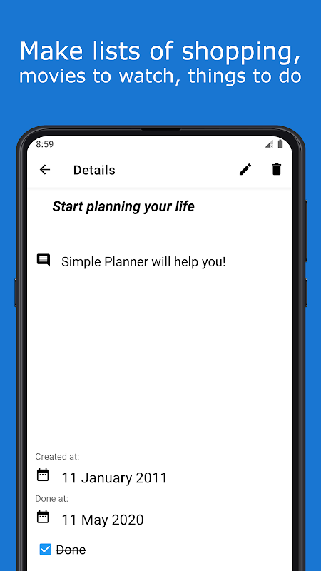 With Simple Planner you can easily organize lists of shopping, movies to watch, things to do.