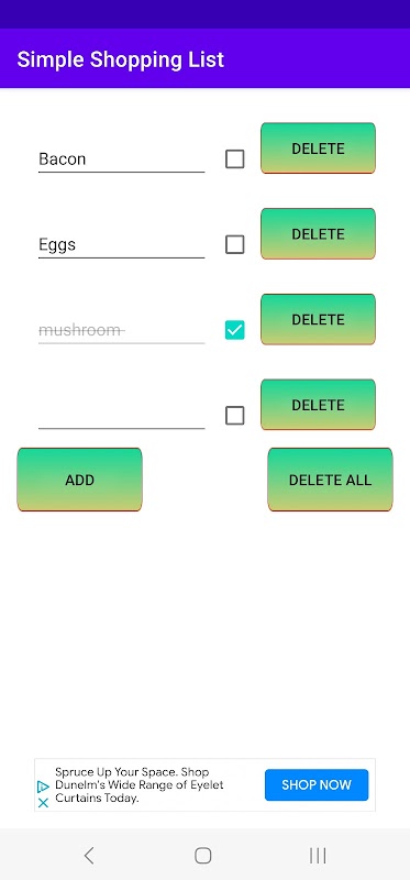 A simple shopping list that lets you add and check off as many items as you wish. Want to delete certain rows? sure want to delete the list and start again, we can do that also!