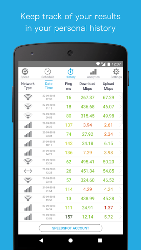 ✓ Keep track of your tests in your personal result history. This includes download and upload speed, ping, signal strength, network name, internal and external IP and the test date.
