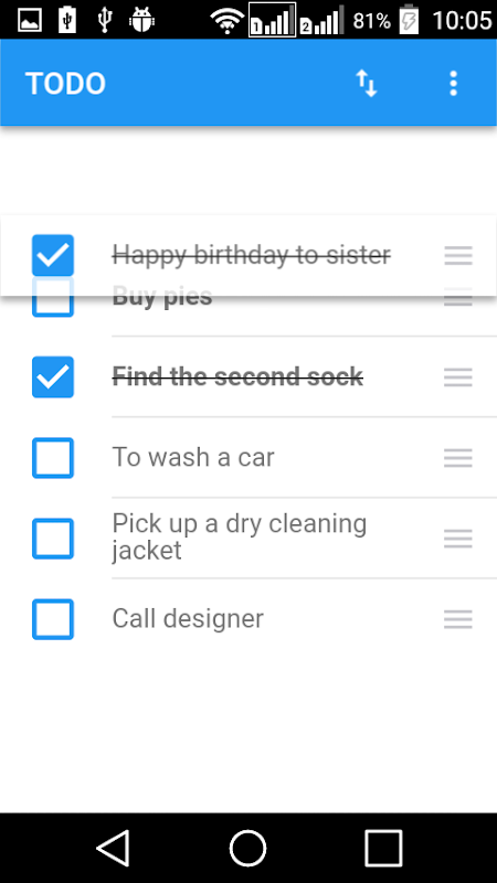 A simple list of tasks with manual sorting. Without advertising. No reference to date or time. No data storage in the cloud. Your task list on your device only. You can add or delete tasks, you can reorder tasks. Nothing more.