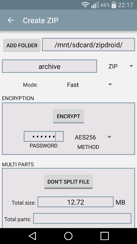 Ok, but what if you have to create a zip file instead? Then again ZipDroid is what you need! You can use the default options from the menu to compress files or whole folders in ZIP or 7z formats. If you want instead a better level of personalization for your compressed archive files, you can choose the CreateZip activity that will let you choose the output format, the compression level and method, set a password and even split the output file in different parts.