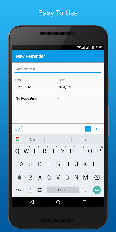 - Self-repeating reminders. Reminder will repeat itself every 10 minutes so you don't miss it. This can be enabled or changed in Settings