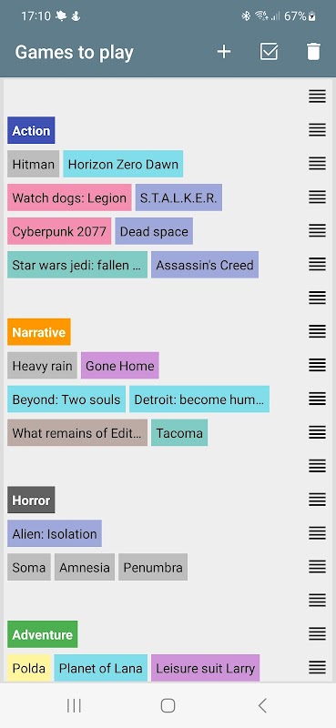 A simple and practical app for managing to-do lists, notes, shopping lists, wish lists, etc. It is very quick and easy to insert a new task (note), set its color and possibly other properties and place it in the appropriate list (page). Just as easily delete or move a task to another place in the list or to another page with a simple swipe. All task lists are clearly displayed on one screen with optional expanding. You can have a preview of your tasks on your home screen in the form of a widget.