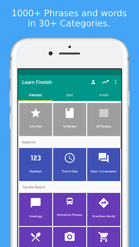 ★★★ Learn Finnish language when visiting Finland ★★★Simply Learn Finnish Language App is a FREE language app that will assist you to speak Finnish quickly and effectively.All Finnish phrases and words are presented to you in both phonetic and original Finnish writing. They are recorded by a native speaker from Finland.Save your favorite phrases and words to review them without fuss.Study your vocabulary with flashcards using the spaced repetition technique.Test your knowledge with fun Finnish language quiz and review your score.★★★ Survive when travelling in Finland ★★★ Use the Finnish phrasebook to survive in Finland. All important survival phrases are included.For example, let the app speak to the Taxi driver in Finland to show them where you want to go.Search all phrases and words to quickly access what you need.★★★ Main Features ★★★✓ 300+ free Finnish phrases and words
