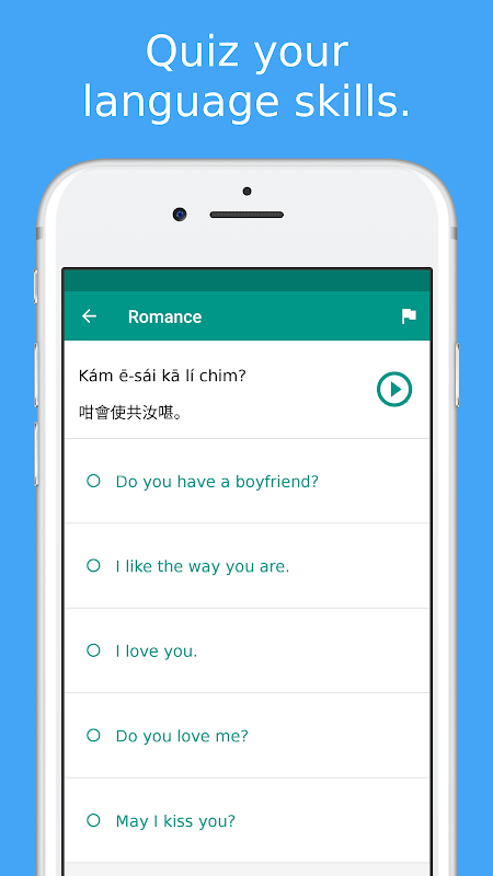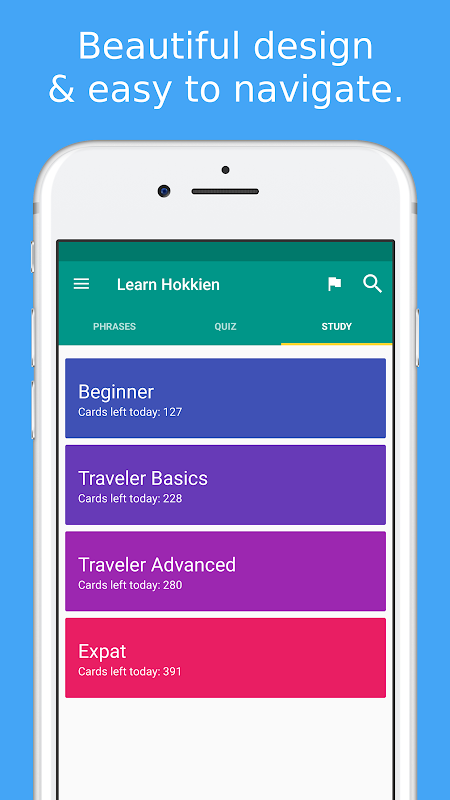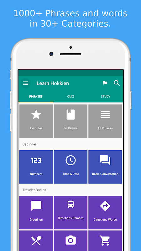 ★★★ Learn Hokkien language when visiting Taiwan ★★★Simply Learn Hokkien Language App is a FREE language app that will assist you to speak Hokkien quickly and effectively.All Hokkien phrases and words are presented to you in both phonetic and original Hokkien writing. They are recorded by a native speaker from Taiwan.Study your vocabulary with flashcards using the spaced repetition technique.Test your knowledge with fun Hokkien language quiz and review your score.★★★ Main Features ★★★✓ 300+ free Hokkien phrases and words