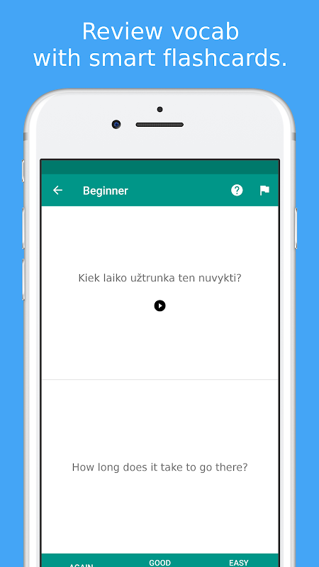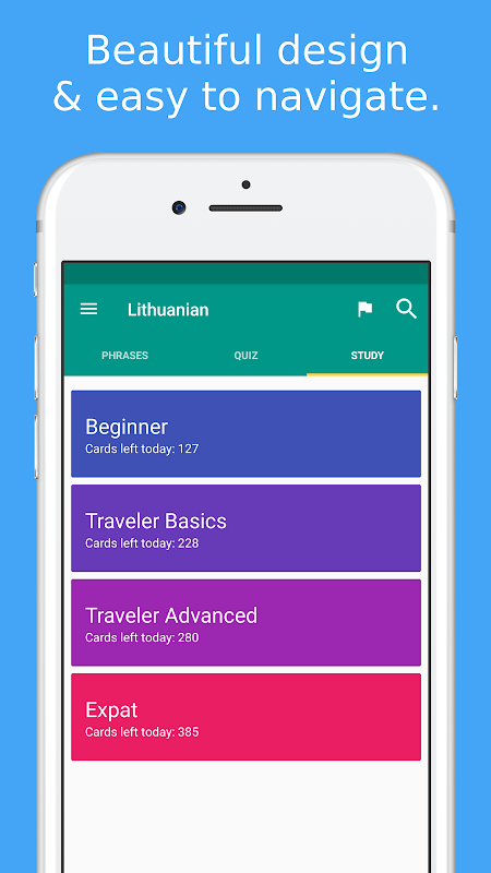 ★★★ Learn lithuanian language when visiting Lithuania ★★★Simply Learn lithuanian Language App is a FREE language app that will assist you to speak lithuanian quickly and effectively.All lithuanian phrases and words are presented to you in both phonetic and original lithuanian writing. They are recorded by a native speaker from Lithuania.Save your favorite phrases and words to review them without fuss.Study your vocabulary with flashcards using the spaced repetition technique.Test your knowledge with fun lithuanian language quiz and review your score.★★★ Survive when travelling in Lithuania ★★★ Use the lithuanian phrasebook to survive in Lithuania. All important survival phrases are included.For example, let the app speak to the Taxi driver in Lithuania to show them where you want to go.Search all phrases and words to quickly access what you need.★★★ Main Features ★★★✓ 300+ free lithuanian phrases and words