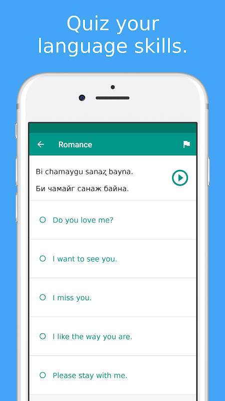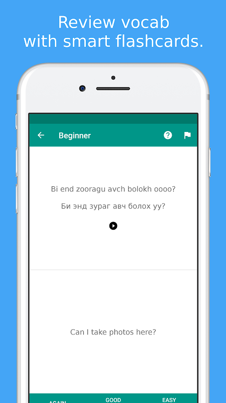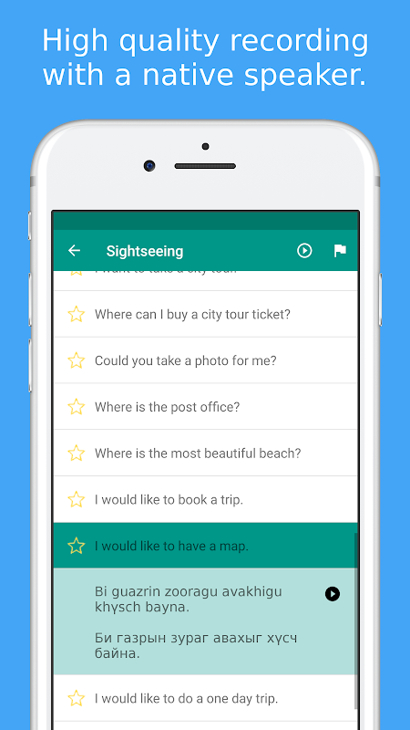 ★★★ Learn Mongolian language when visiting Mongolia ★★★Simply Learn Mongolian Language App is a FREE language app that will assist you to speak Mongolian quickly and effectively.All Mongolian phrases and words are presented to you in both phonetic and original Mongolian writing. They are recorded by a native speaker from Mongolia.Save your favorite phrases and words to review them without fuss.Study your vocabulary with flashcards using the spaced repetition technique.Test your knowledge with fun Mongolian language quiz and review your score.★★★ Survive when travelling in Mongolia ★★★ Use the Mongolian phrasebook to survive in Mongolia. All important survival phrases are included.For example, let the app speak to the Taxi driver in Mongolia to show them where you want to go.Search all phrases and words to quickly access what you need.★★★ Main Features ★★★✓ 300+ free Mongolian phrases and words