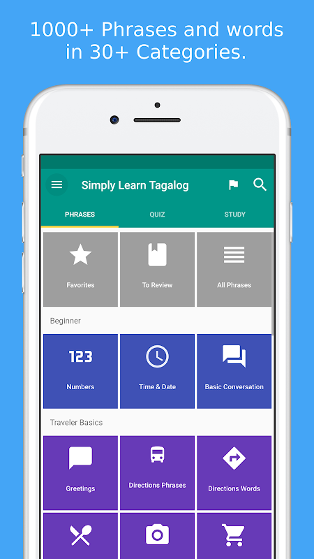 * Advanced Conversation 💬 * Health 💊 * Border Crossing 🗺️ * Questions ❓ * Places 📍 * Food 🥘 * Vegetables 🥕 * Fruits 🍋 * Colors 🖍️ * Romance I ❤️ * Romance II ❤️ * Post Office 📬 * Phone & Internet ☎️ * Banking 🏦 * Occupations 💻 * Business Talk 👔 * Hobbies 💖 * Feelings 😊 * Body 🦵 * Animals 🐎 * Family 👨👩👧 * Countries 🗺️★★★ Feedback appreciated 👍★★★If you like this app, please take a few seconds to give a rating or review. If you have any feedback, suggestions or advise I am more than happy if you let me know.★★★About US 📣★★★ Website: www.simplylearnlanguages.com/tagalog