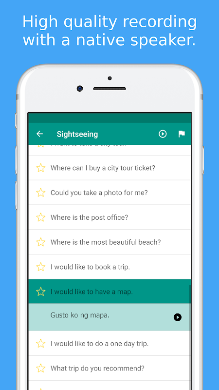 ★★★ How to say Thank you in Tagalog? Learn 1000+ useful words and phrases in Tagalog language with Simply Learn Tagalog when visiting Philippines 🇵🇭★★★Simply Learn Tagalog Language App is a FREE 🆓 language app that will assist you to speak Tagalog quickly and effectively ⚡.All Tagalog phrases and words are presented to you in both phonetic and original Tagalog writing. They are recorded by a native speaker from Philippines 👧🏻.Save your favorite phrases and words to review them without fuss ❤️.Study your vocabulary with flashcards using the spaced repetition technique.Test your knowledge with fun Tagalog language quiz and review your score.★★★ Survive when travelling in Philippines 🗺️🇵🇭★★★ Use the Tagalog phrasebook to survive in Philippines. All important survival phrases are included.For example, let the app speak to the Taxi driver 🚕 in Philippines to show them where you want to go.Search all phrases and words to quickly access what you need.★★★ Main Features ★★★✓ 💬 300+ free Tagalog phrases and words