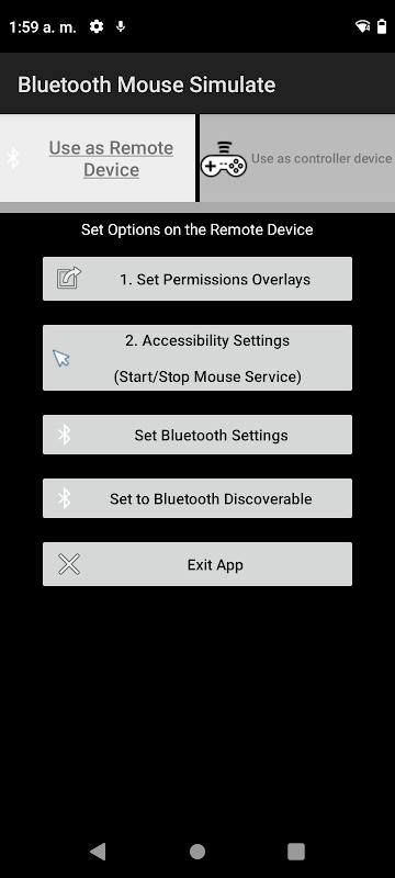 If the user agrees to use this feature AccessibilityService , the application will have the ability to simulate the mouse pointer on the screen and wait for Bluetooth commands to move the cursor. Otherwise, if the user rejects the use of this function, it cannot be used as a receiving device but can be used as a controlling device.