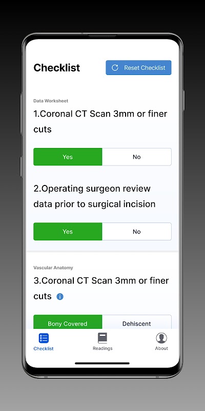 This app was designed by the creator as a pre-operative sinus surgery CT checklist to help trainees and Otolaryngologists who are performing endoscopic sinus surgery. The checklist aims to highlight high-risk anatomical structures that should be identified on the CT scan prior to commencing surgery to help enable a safe outcome. Key structures related to vascular, orbital and skull base anatomy must be identified, classified and "checked-off" on the list. This list has been previously validated as a useful educational tool for resident trainees.