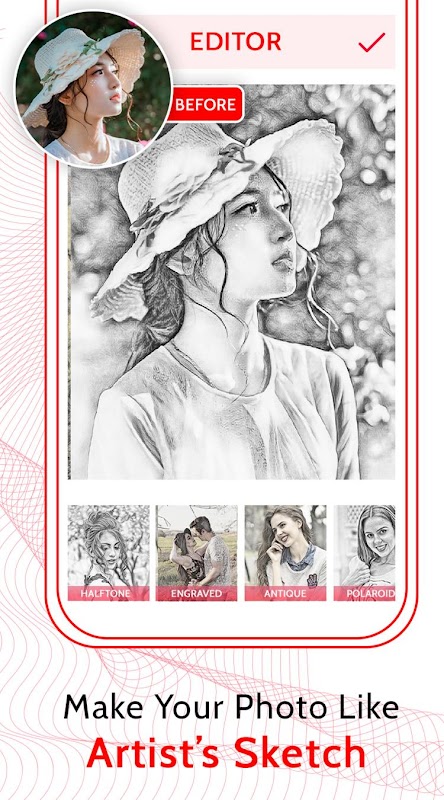 Pencil Photo Sketch is a photo sketch maker app with tons of Sketch Image Filters that will make your photos extraordinary.Pencil Sketch also allows you to Make Cartoon Photos, Black and White (Grey) Photos, Or Crayon Drawing Photos.
