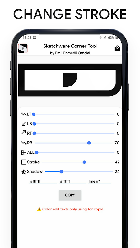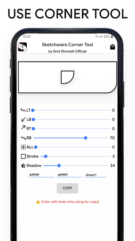 Use Sketchware Corner tool and make your own cornered linear! Use EE Official apps and make better featured apps! Change corners and copy your own corner code. Paste to sketchware and click run. And done! Your Linear have corners and stroke!
