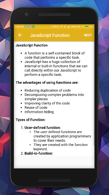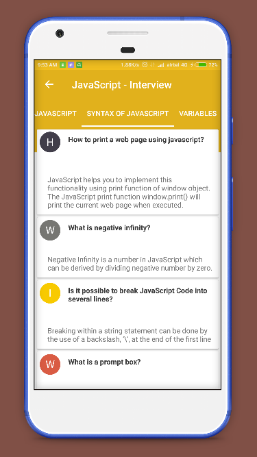 The “JavaScript Skill” is an app designed to provide complete reference to support JavaScript learner(s). The JavaScript Skill app has very descriptive and managed tutorial content with simple UI, which will keep you engaged to learn.