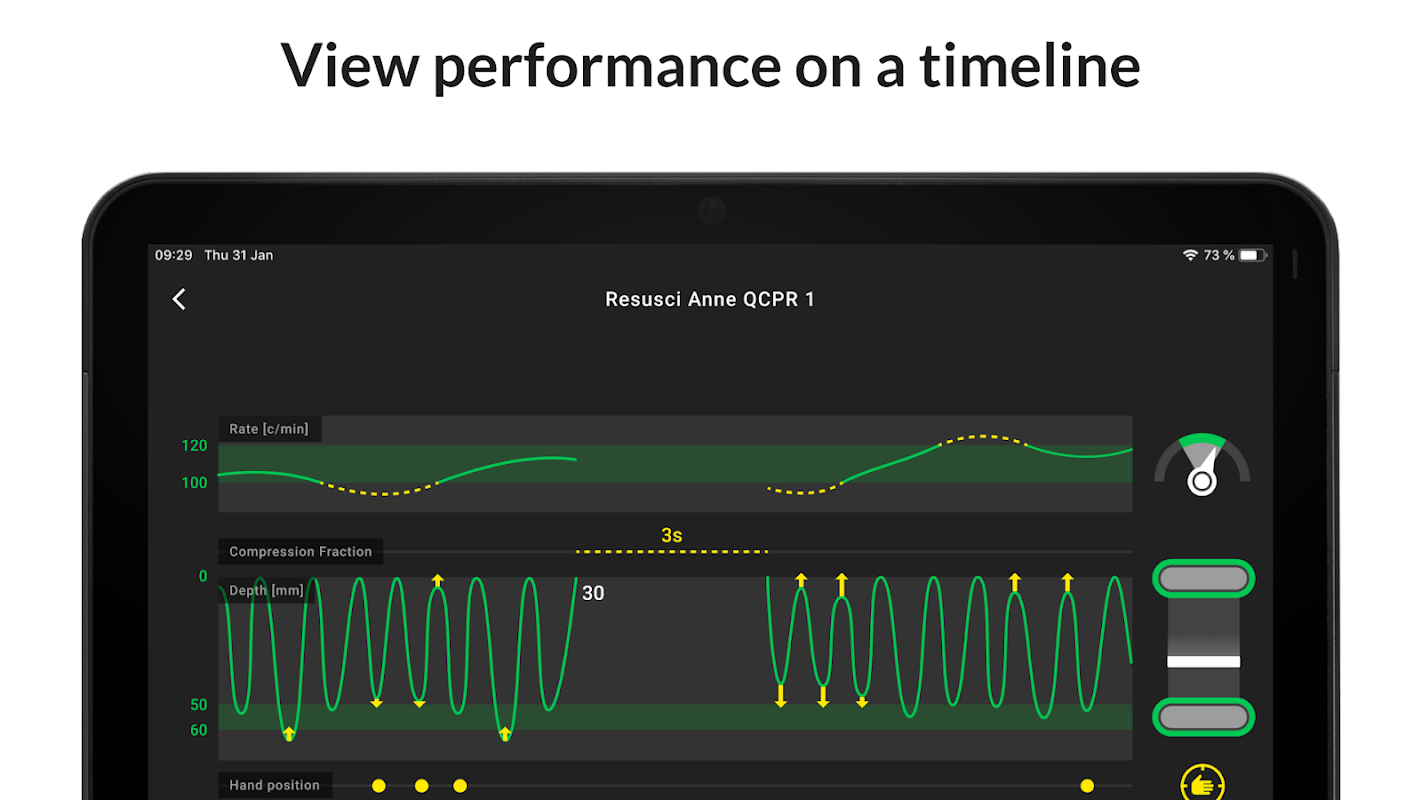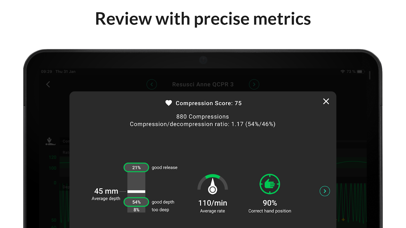 - Get detailed feedback on chest compression fraction – one of the most important components of high-performance CPR
