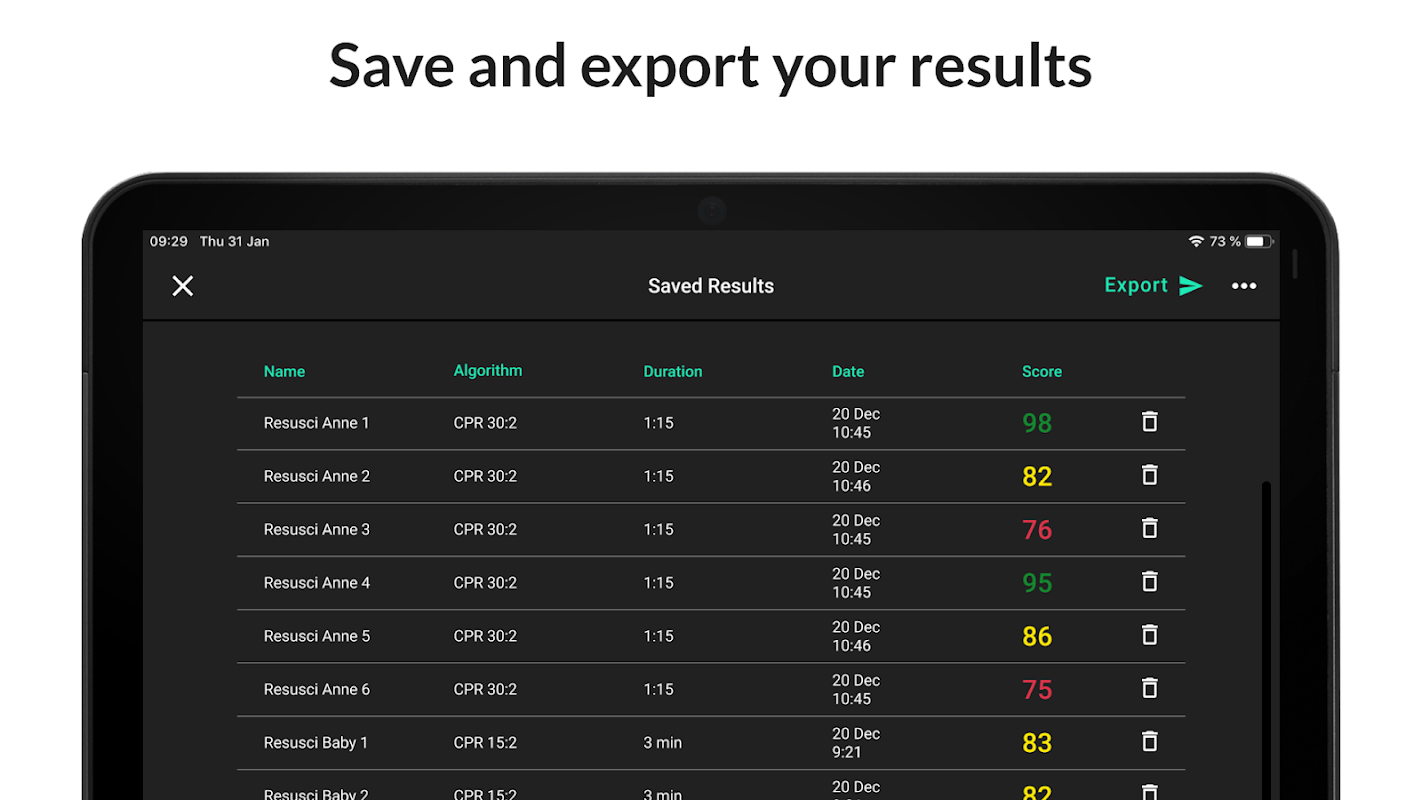 - Access saved results and reports, including saved CPR timelines and session information, and export for analysis outside of the app