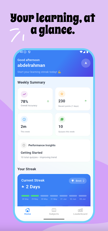 Gamified quizzes to master school subjects & track progress every day.