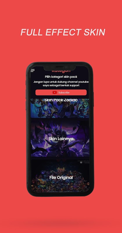 Pada aplikasi ini tersedia banyak MOD SKIN dan juga file aslinya yang dapat didownload dan dipasang secara langsung tanpa ribet. MOD SKIN akan ditambahkan setiap saat tanpa harus update aplikasi di playstore, nanti akan ada notifikasi ketika ada update MOD SKIN yang baru.