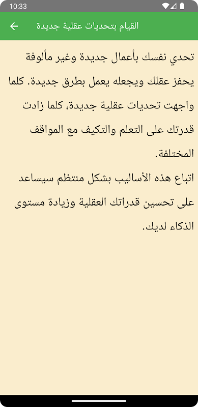 Discover effective ways to increase your intelligence and develop your mental skills with this comprehensive application. The application offers multiple strategies that include continuous learning, solving puzzles and mind games, and practicing meditation to improve concentration and critical thinking ability. It also encourages reading regularly, exercising, and eating healthy food to enhance brain function. Learning to play a musical instrument, participating in intellectual discussions, and organizing your time effectively are all steps that will help you build a strong, developed mind. Get the tools you need to improve your intelligence and creativity in your daily life.