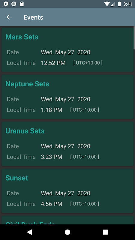 The times of upcoming phenomena are shown on the Events screen, including: