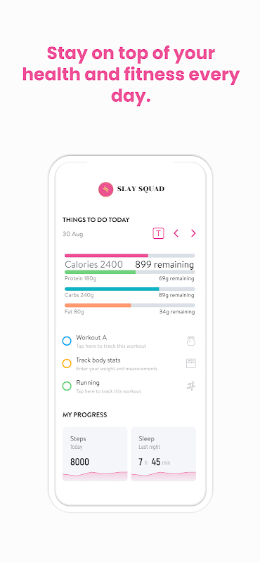 With the Slay Squad App, you will have access to workout programs designed specifically to help you reach your fitness and health goals! You can follow & track your workouts, your nutrition, your lifestyle habits, measurements and results–all with the help of your coach.