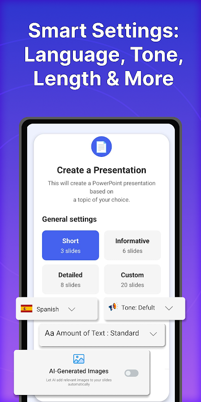 With our advanced AI-Powered gpt Presentation, creating presentations has never been easier. Simply input your topic, and watch as our app generates a stunning presentation tailored to your needs. From business pitches to educational lectures, we've got you covered!
