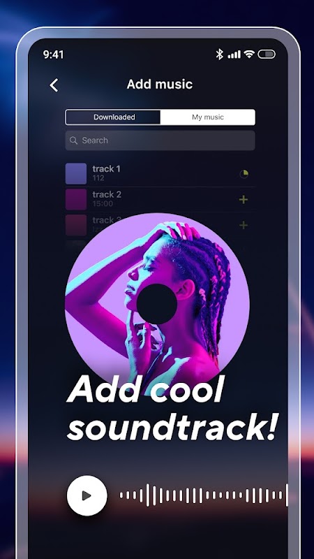 - ADD MUSIC: select a track from our own music library or add something of your own! Add sounds, music tracks and voice-over to your video.