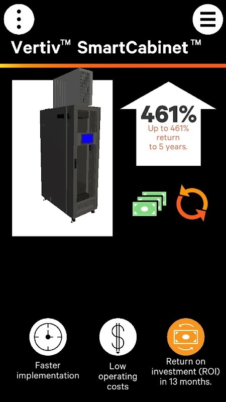 You will find additional information on Vertiv products and services, data center trends, SmartCabinet components, and test your knowledge of the information in the app through a video game.