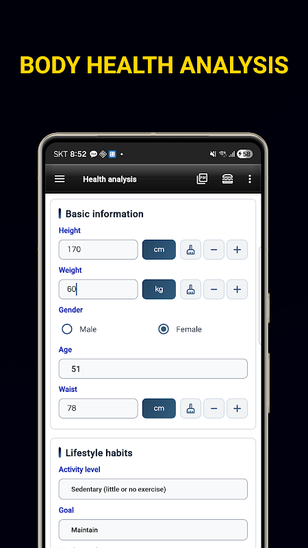 Comprehensive health information analysis based on height, weight, and waist circumference input. Provides BMI (body mass index), ideal weight, body fat percentage, basal metabolic rate, recommended calories, and water intake.