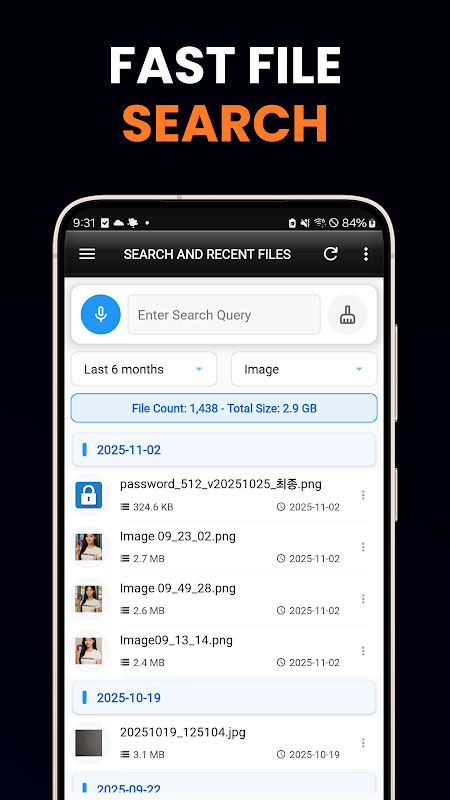 - Provides a quick search function for images, audio, videos, documents, and APK by period