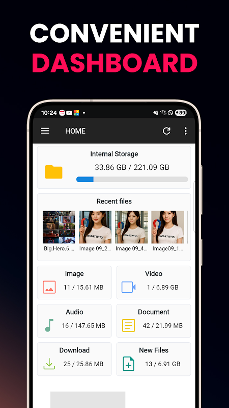 It provides storage capacity and usage status visualization information and a quick search function for recent files, and ensures easy accessibility with a home screen widget. Use the file management functions you need conveniently in one place.