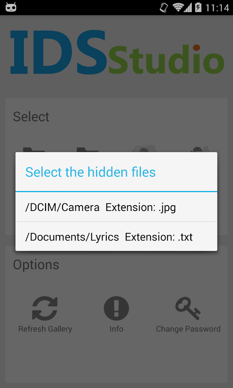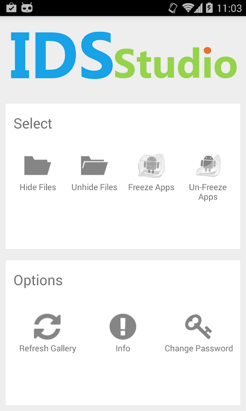 "Smart Hide Calculator" is a fully functional calculator app but with a little twist. Once you enter the password(u get to set it on first start of app and can also be changed in future) and press the '=' button then boom you are presented to an interface where you can hide, unhide pictures, videos, documents or files with any file extension placed in a folder on sdcard, and if your device have root you can also hide (freeze) and unhide (un-freeze) apps.